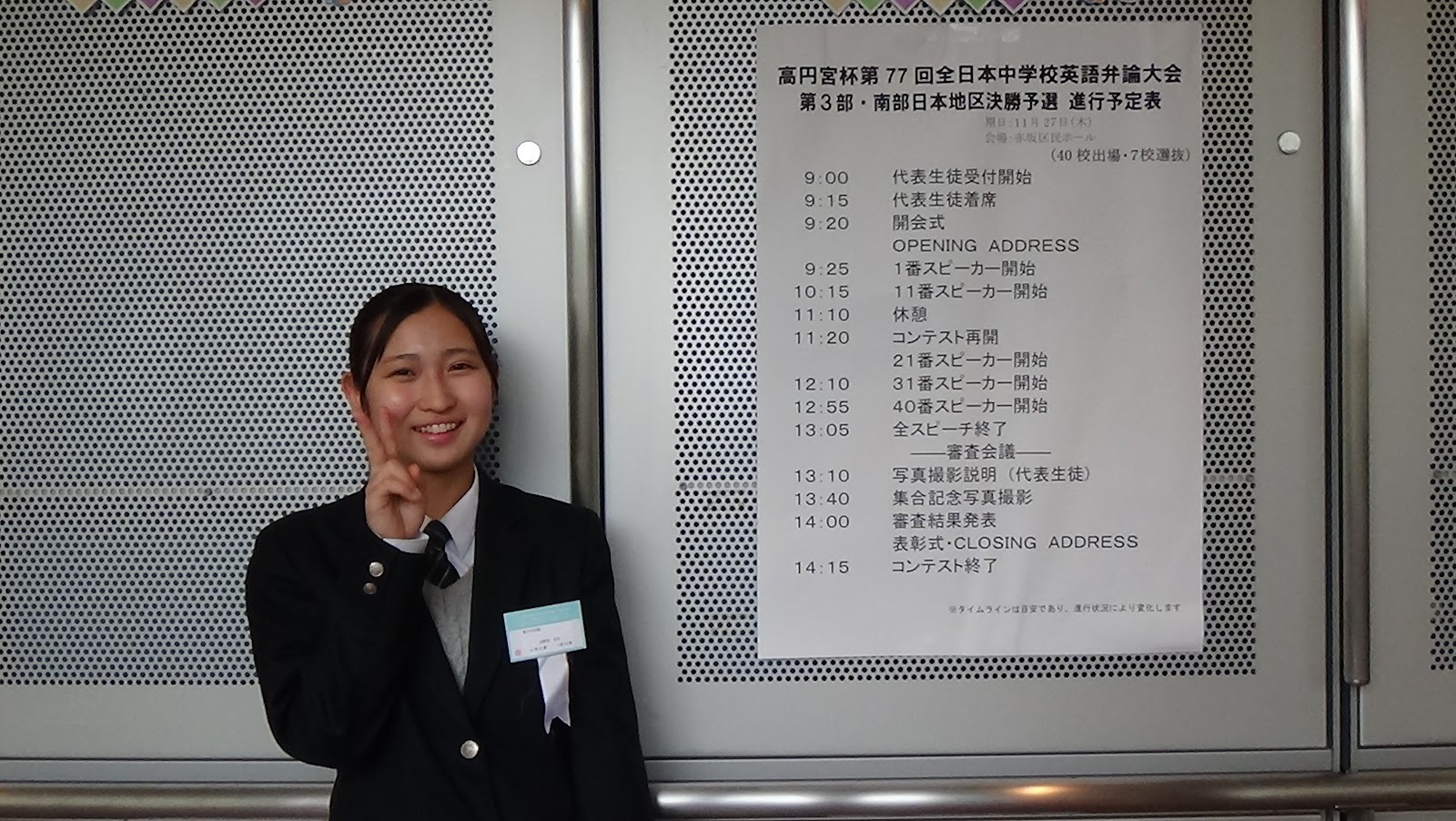 11月26日、27日の2日間にわたり、東京都の赤坂区民センターにて、高円宮杯第77回全日本中学校英語弁論大会決勝予選大会が行われました。決勝予選大会には計151名が出場し、そのうち27名が28日の決勝大会へ臨みます。
